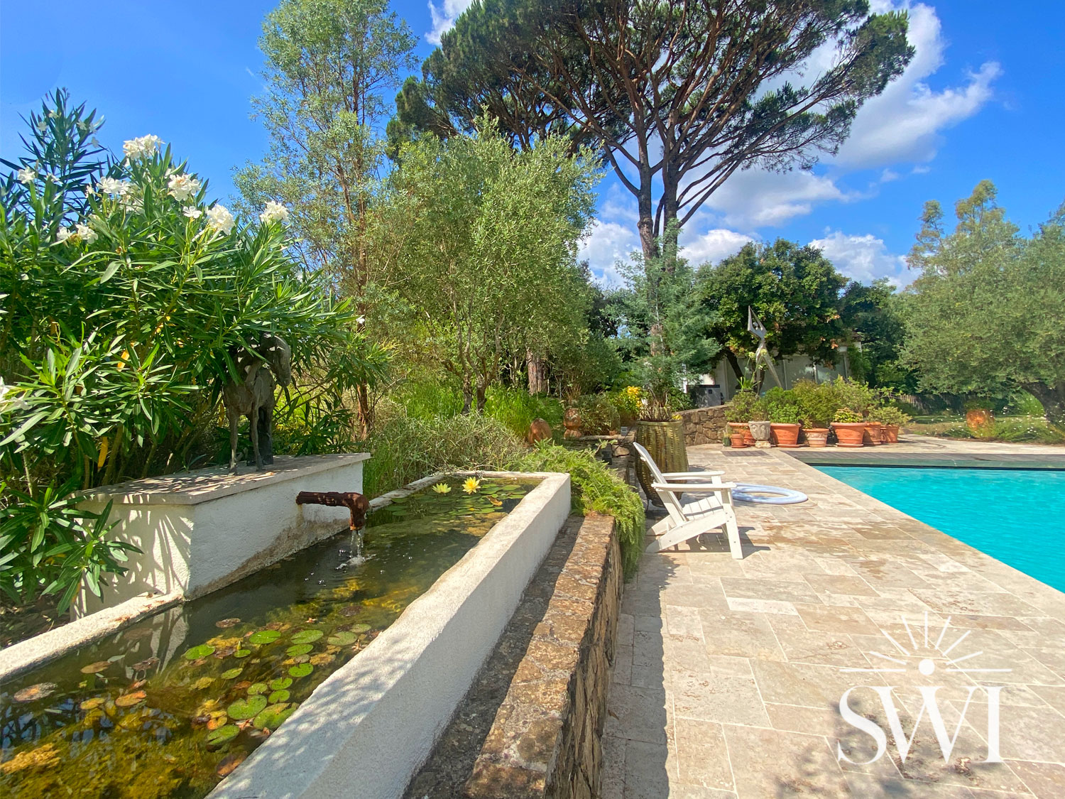 The heated 12 x 7 m swimming pool, surrounded by wide terraces, is enhanced by a fountain with fish, adding to the charm of this property.