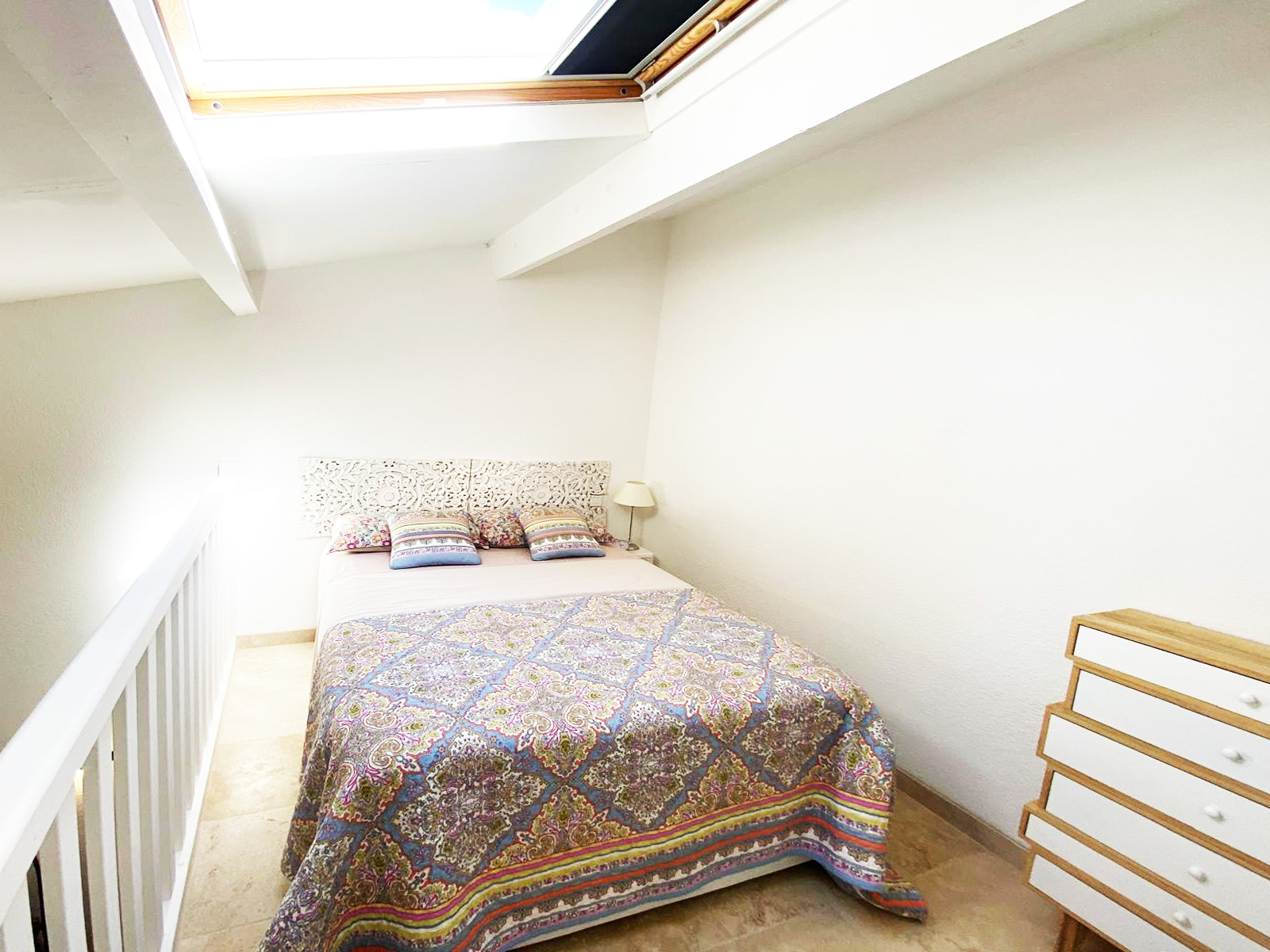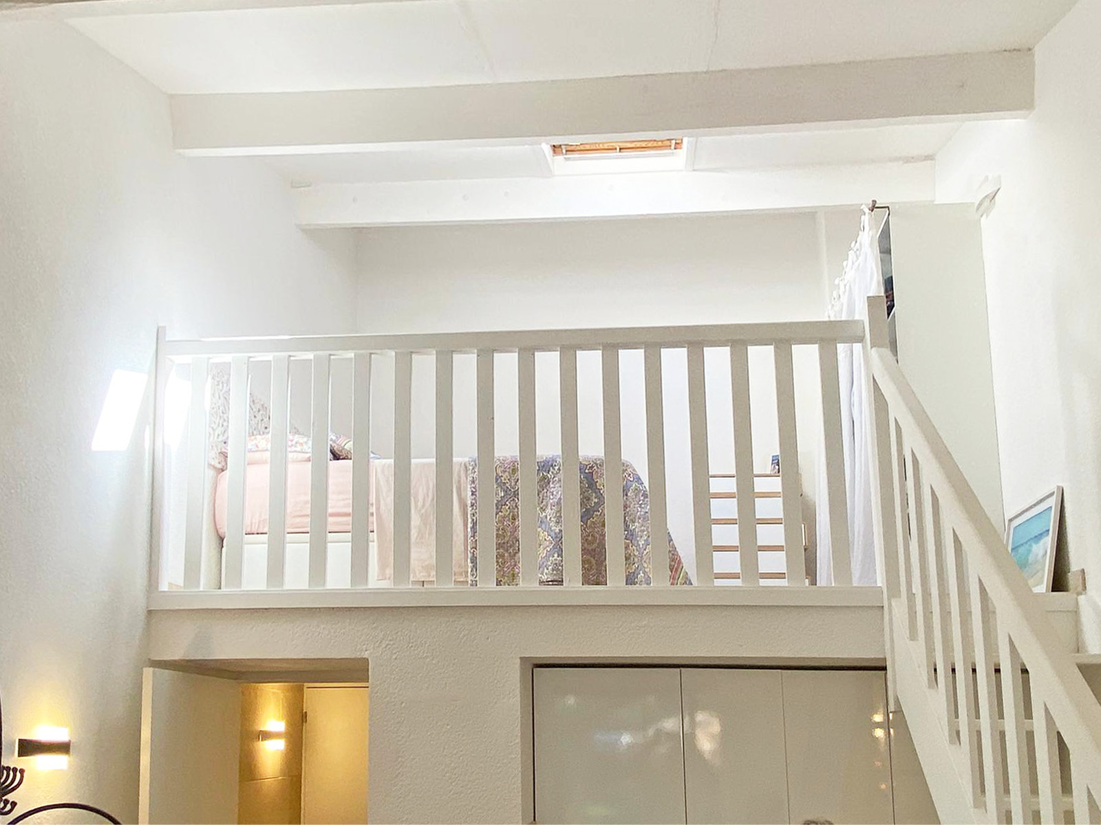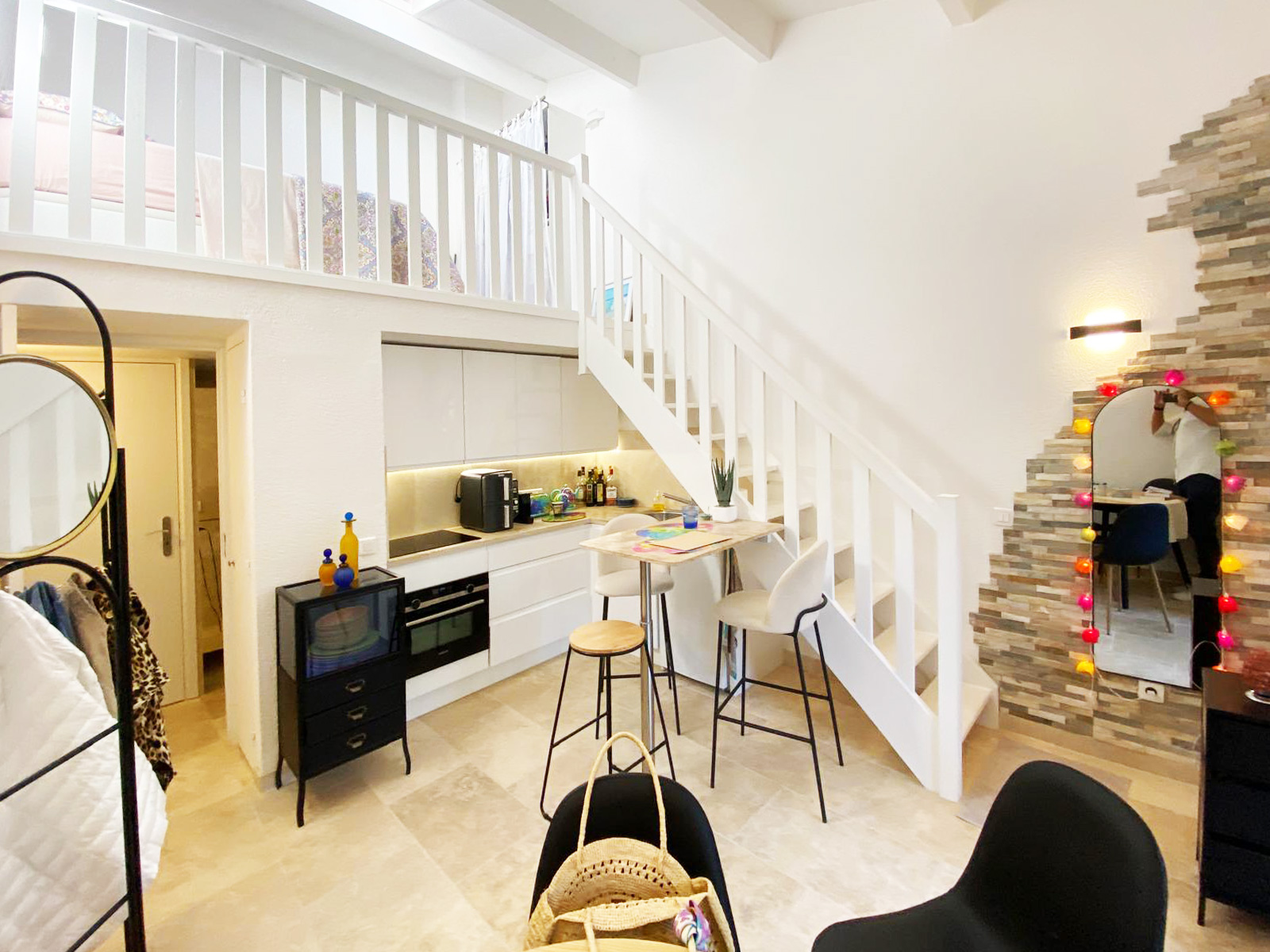 The property features a bright living room with a fully equipped and functional kitchen, a mezzanine bedroom, and a modern bathroom.\
